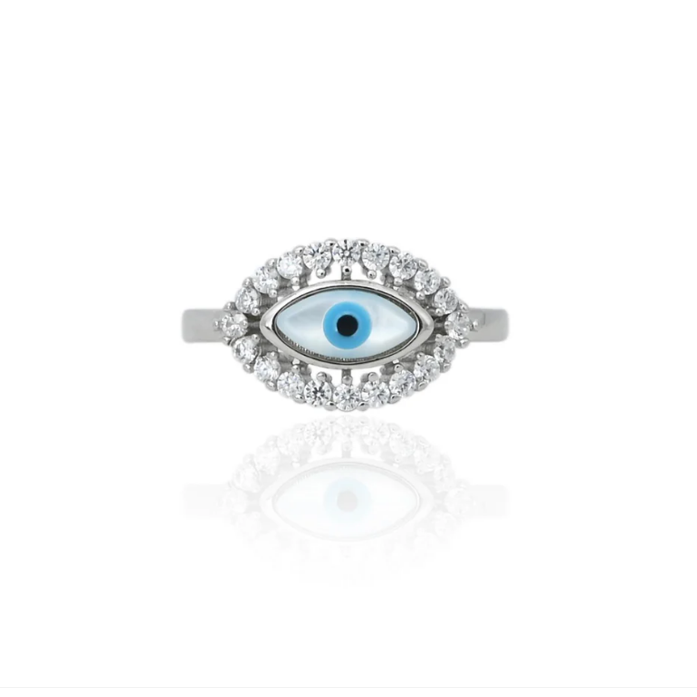A unique blend of elegance and protection, this sterling silver ring features a butterfly design adorned with sparkling white stones and a striking blue evil eye...