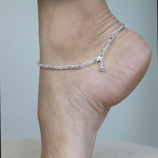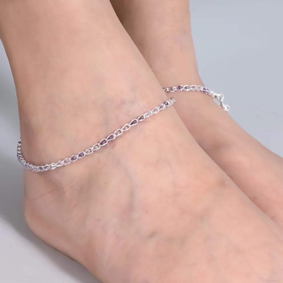 Minimal Silver Anklet with Purple Moti – Elegant and Simple Design.