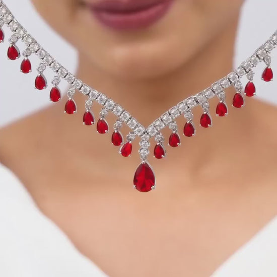 This silver necklace features a line of zircons with a festoon arrangement of peardrop motifs studded with red stones sporting a larger peardrop in the centre. Celebrate your moments of passion with Prachi Silverβs Red Romance Collection.