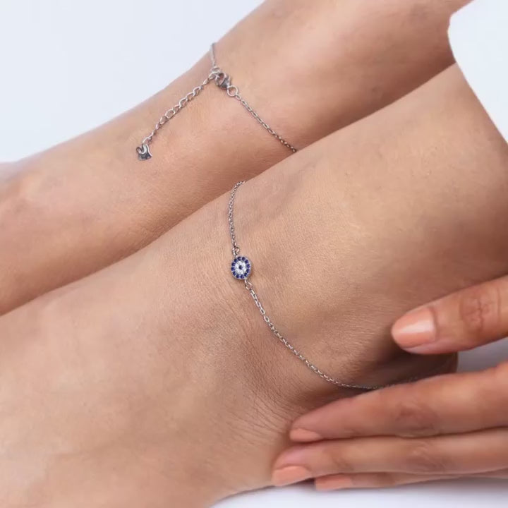 This silver anklet features a white and blue zircon studded evil eye design in the centre.