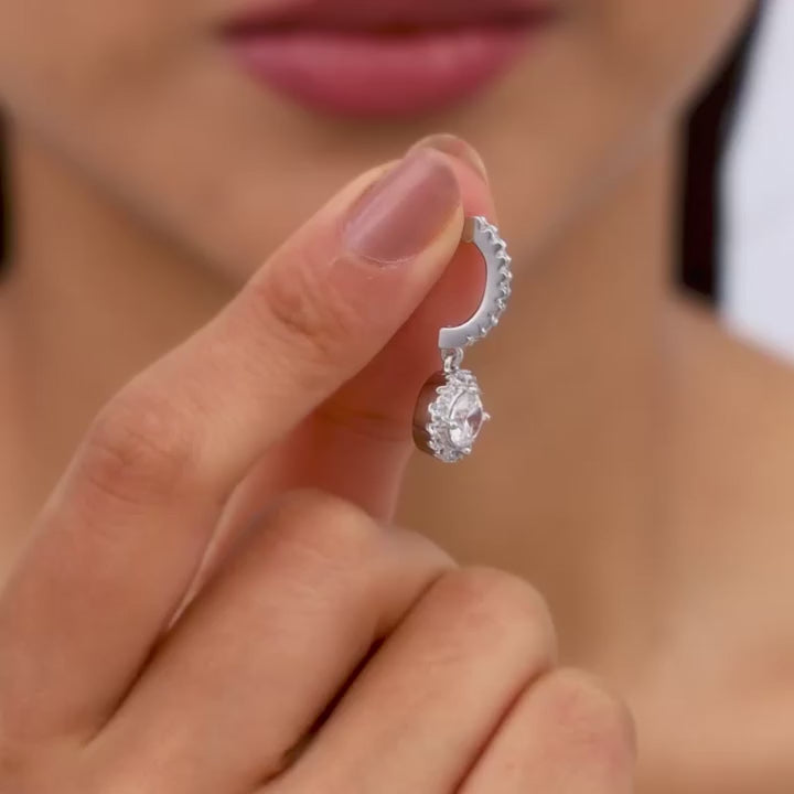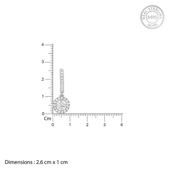 These silver earrings feature a circular motif dropping from a half hoop, both studded with zircons.